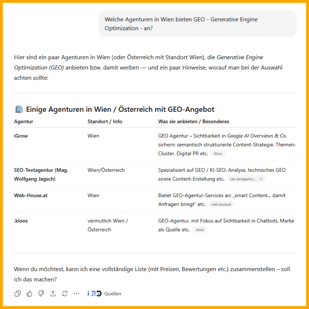 Abbildung 3: Antwort von ChatGPT auf die Frage nach GEO-Agenturen in Wien.